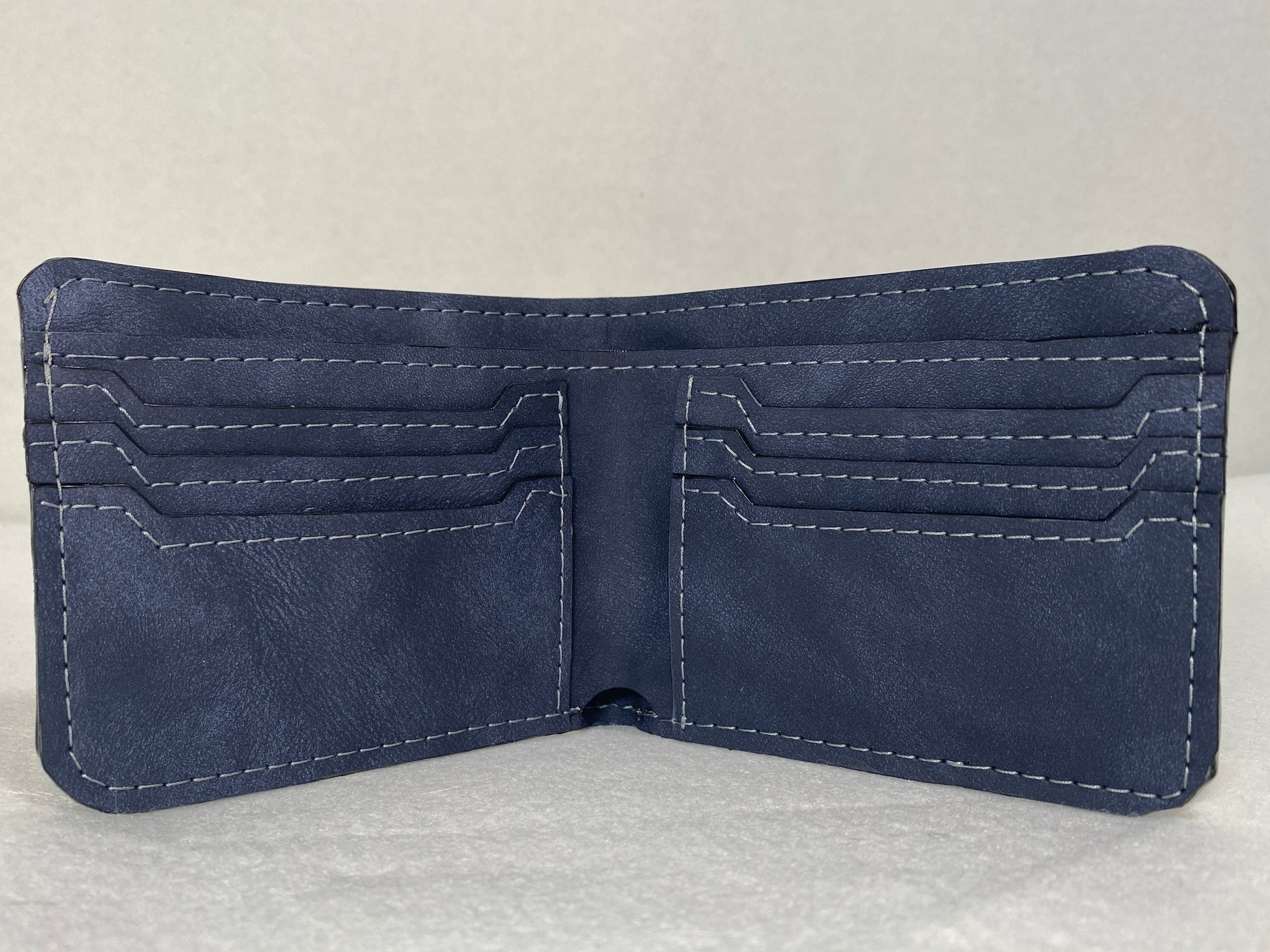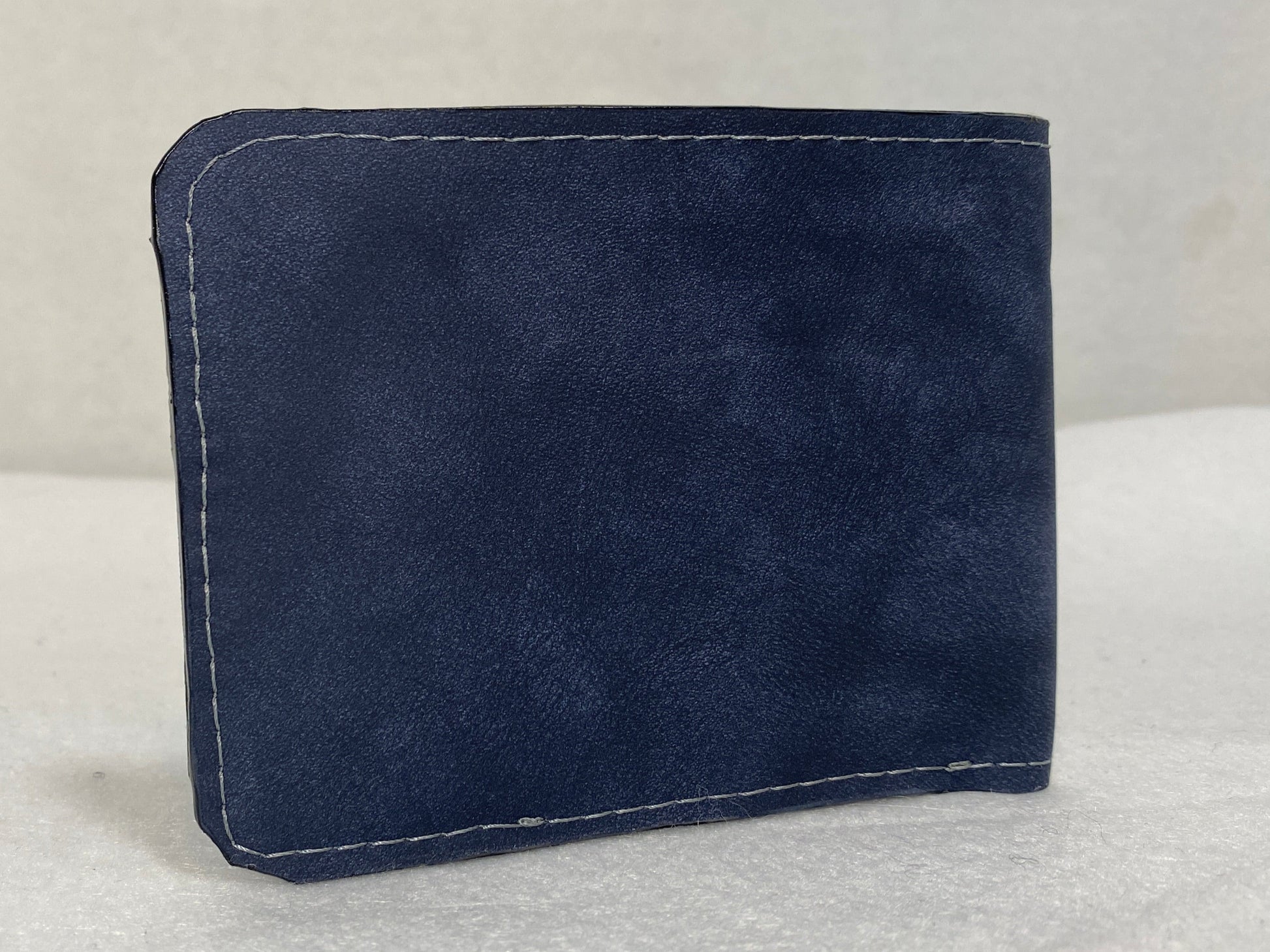 Crafted from soft faux suede, this blue bifold wallet offers a sleek and durable design. It features a spacious money slot and six card slots, providing organized storage for your essentials. When closed, it measures 4.5" by 3.5" and unfolds to 8.5" by 3.5" for easy access. Ideal for those seeking a practical yet stylish accessory.