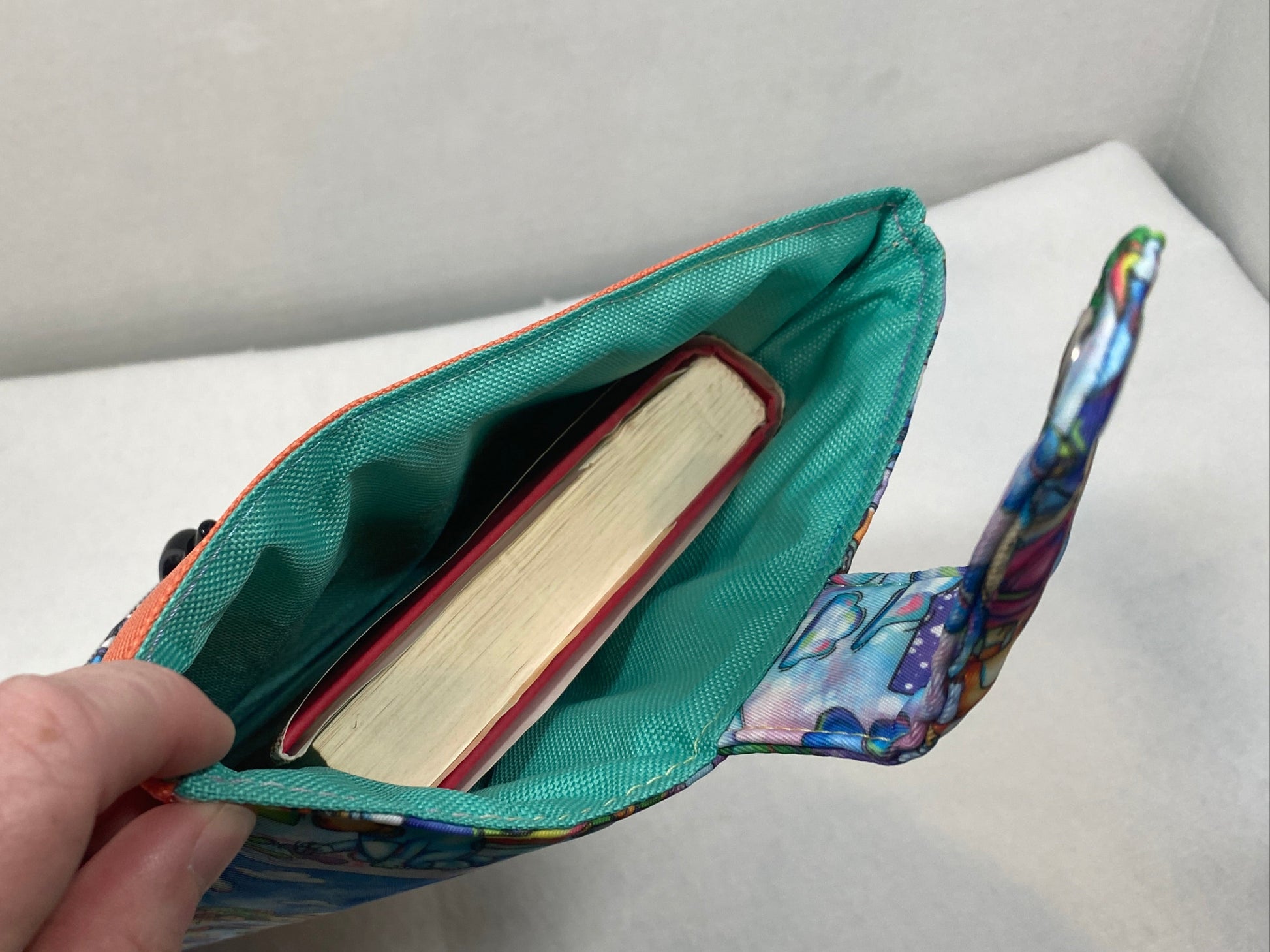 Protect your books in style with this bluey-themed book sleeve, crafted from durable waterproof canvas and nylon. Measuring 11" tall by 8.5" wide, it features a secure snap button closure, a convenient 6" by 8" slip pocket, and a 5" by 8" zipper pocket to keep your essentials organized and dry. Ideal for book lovers seeking both functionality and charming design.