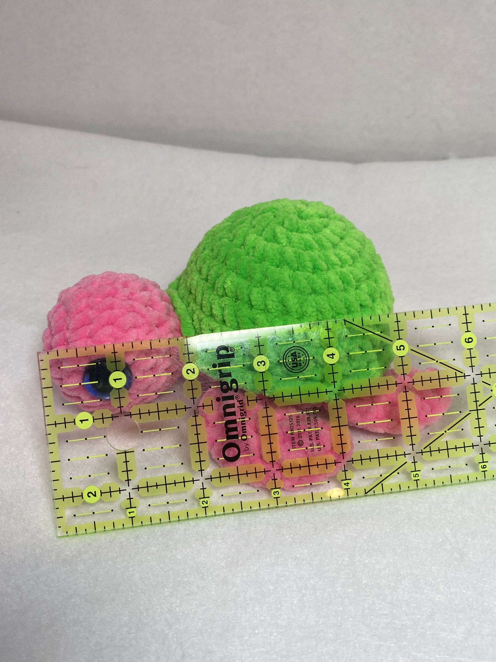 This expertly crafted crochet turtle features a charming combination of pink and green yarn, measuring 6 inches in length and width, with a height of 3.5 inches. Its compact size makes it an ideal decorative piece or a thoughtful handmade gift, showcasing skilled crochet artistry and attention to detail.