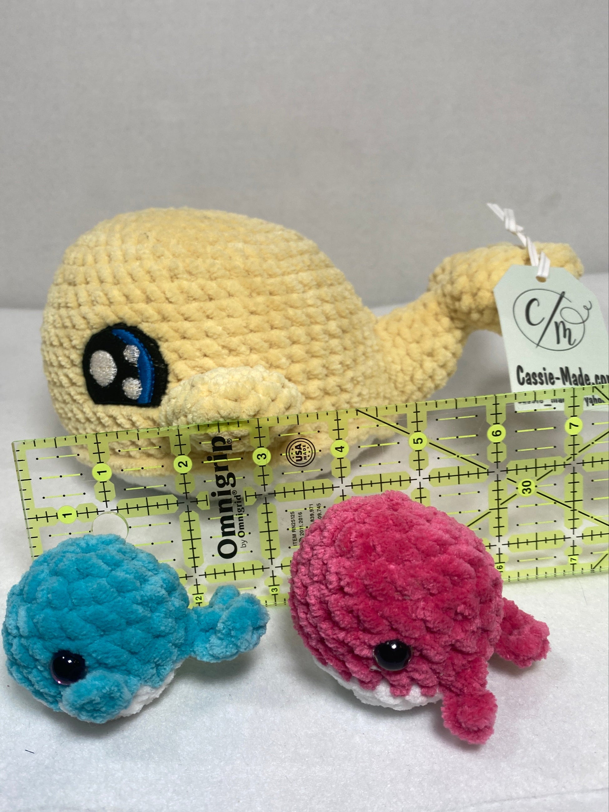 This expertly crafted crochet yellow mama whale features a secure pouch beneath her belly, designed to hold her two tiny babies close. Measuring 9" by 8" and standing 4.5" tall, the mama whale offers a charming and sturdy design. Each baby whale measures 2.5" by 2.5" and stands 2.5" high, perfectly sized to nestle safely in the pouch. This set combines delicate craftsmanship with thoughtful detail, making it a unique and heartwarming addition to any collection.